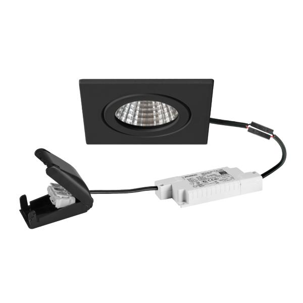 LED-Einbaudownlightset, V4A, IP54, Phasenabschnitt dimmbar, mit Anschlussbox, schwarz matt, quadratisch. Ausgeführt in kompakter Bauform für werkzeuglose Schnellmontage zum Deckeneinbau. Set inkl. Konverter für 230 V-Netzspannung, Phasenabschnitt dimmbar, Maße Konverter: L 110 x B 50 x H 19 mm Montageart: Einbaumontage, Montageort: Deckenmontage, Material: Edelstahl V4A / Aluminium / Glas / Kunststoff, Schutzart raumseitig: nach DIN EN 60529: IP54, Schutzklasse: (EN 61140) II, Spannung: 230V AC 50Hz, Leistung: 6 W, Anzahl der Leuchtmittel / Fassungen: 1 Stück, Lichtstrom: 730 lm, Farbtemperatur: 3.000 K, Abstrahlwinkel: 38°, Verstellbarkeit: nicht verstellbar, Mit Betriebsgerät: Ja, Dimmbar: Ja, Art der Dimmung: Phasenabschnitt.