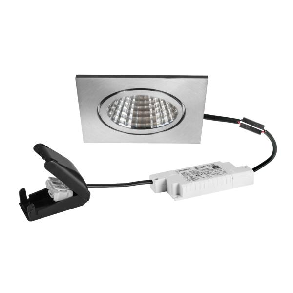 LED-Einbaudownlightset, V4A, IP54, Phasenabschnitt dimmbar, mit Anschlussbox, edelstahl matt, quadratisch. Ausgeführt in kompakter Bauform für werkzeuglose Schnellmontage zum Deckeneinbau. Set inkl. Konverter für 230 V-Netzspannung, Phasenabschnitt dimmbar, Maße Konverter: L 110 x B 50 x H 19 mm Montageart: Einbaumontage, Montageort: Deckenmontage, Material: Edelstahl V4A / Aluminium / Glas / Kunststoff, Schutzart raumseitig: nach DIN EN 60529: IP54, Schutzklasse: (EN 61140) II, Spannung: 230V AC 50Hz, Leistung: 6 W, Anzahl der Leuchtmittel / Fassungen: 1 Stück, Lichtstrom: 730 lm, Farbtemperatur: 3.000 K, Abstrahlwinkel: 38°, Verstellbarkeit: nicht verstellbar, Mit Betriebsgerät: Ja, Dimmbar: Ja, Art der Dimmung: Phasenabschnitt.