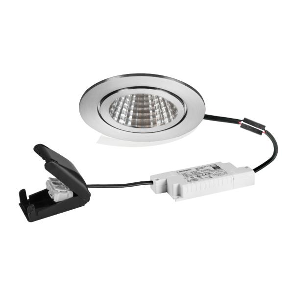 LED-Einbaudownlightset, V4A, IP54, Phasenabschnitt dimmbar, mit Anschlussbox, edelstahl matt, rund. Ausgeführt in kompakter Bauform für werkzeuglose Schnellmontage zum Deckeneinbau. Set inkl. Konverter für 230 V-Netzspannung, Phasenabschnitt dimmbar, Maße Konverter: L 110 x B 50 x H 19 mm Montageart: Einbaumontage, Montageort: Deckenmontage, Material: Edelstahl V4A / Aluminium / Glas / Kunststoff, Schutzart raumseitig: nach DIN EN 60529: IP54, Schutzklasse: (EN 61140) II, Spannung: 230V AC 50Hz, Leistung: 6 W, Anzahl der Leuchtmittel / Fassungen: 1 Stück, Lichtstrom: 730 lm, Farbtemperatur: 3.000 K, Abstrahlwinkel: 38°, Verstellbarkeit: nicht verstellbar, Mit Betriebsgerät: Ja, Dimmbar: Ja, Art der Dimmung: Phasenabschnitt.