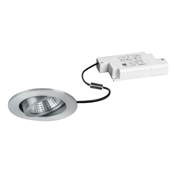 LED-Einbaustrahlerset, IP65, Phasenabschnitt dimmbar, alu matt, rund. Ausgeführt in kompakter Bauform für werkzeuglose Schnellmontage zum Deckeneinbau. Set inkl. Konverter für 230 V-Netzspannung, Phasenabschnitt dimmbar, Maße Konverter: L 110 x B 50 x H 19 mm Ausführung: ohne Fassung, Montageart: Einbaumontage, Montageort: Deckenmontage, Material: Aluminium / Stahl / Silikonkautschuk / Polycarbonat, Schutzart raumseitig: nach DIN EN 60529: IP65, Schutzklasse: (EN 61140) II, Spannung: 230V AC 50Hz, Leistung: 6 W, Anzahl der Leuchtmittel / Fassungen: 1 Stück, Lichtstrom: 730 lm, Farbtemperatur: 3.000 K, Abstrahlwinkel: 38°, Verstellbarkeit: schwenkbar, Mit Betriebsgerät: Ja, Dimmbar: Ja, Art der Dimmung: Phasenabschnitt.