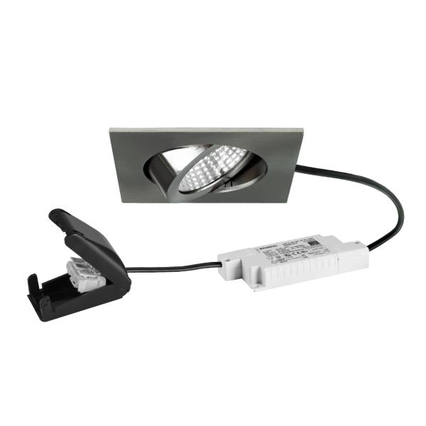 LED-Einbaustrahlerset, Phasenabschnitt dimmbar, mit Anschlussbox, nickel matt, quadratisch. Ausgeführt in kompakter Bauform für werkzeuglose Schnellmontage zum Deckeneinbau. Set inkl. Konverter für 230 V-Netzspannung, Phasenabschnitt dimmbar, Maße Konverter: L 110 x B 50 x H 19 mm Montageart: Einbaumontage, Montageort: Deckenmontage, Material: Aluminium / Polycarbonat, Schutzart raumseitig: nach DIN EN 60529: IP20, Schutzklasse: (EN 61140) II, Spannung: 230V AC 50Hz, Leistung: 6 W, Anzahl der Leuchtmittel / Fassungen: 1 Stück, Lichtstrom: 630 lm, Farbtemperatur: 3.000 K, Abstrahlwinkel: 38°, Verstellbarkeit: schwenkbar, Mit Betriebsgerät: Ja, Dimmbar: Ja, Art der Dimmung: Phasenabschnitt.