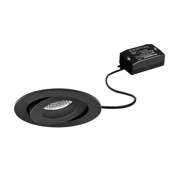 LED-Einbaustrahlerset, schaltbar, strukturschwarz, rund. Ausgeführt in kompakter Bauform für werkzeuglose Schnellmontage zum Deckeneinbau. Set inkl. Konverter für 230 V-Netzspannung, schaltbar, Maße Konverter: L 68 x B 35 x H 21 mm Montageart: Einbaumontage, Montageort: Deckenmontage, Material: Aluminium / Polycarbonat, Schutzart raumseitig: nach DIN EN 60529: IP20, Schutzklasse: (EN 61140) II, Spannung: 230V AC 50Hz, Leistung: 7 W, Anzahl der Leuchtmittel / Fassungen: 1 Stück, Lichtstrom: 680 lm, Farbtemperatur: 3.000 K, Abstrahlwinkel: 40°, Verstellbarkeit: schwenkbar, Mit Betriebsgerät: Ja, Dimmbar: Nein, Art der Dimmung: schaltbar.