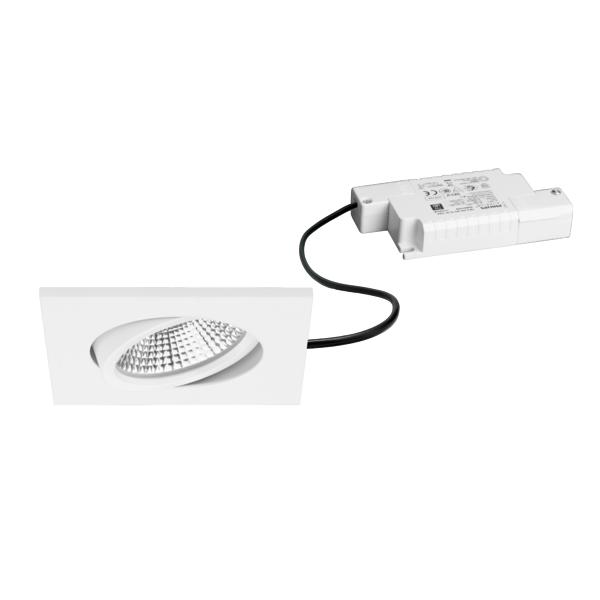 LED-Einbaustrahlerset, IP65, Phasenabschnitt dimmbar, strukturweiß, quadratisch. Ausgeführt in kompakter Bauform für werkzeuglose Schnellmontage zum Deckeneinbau. Set inkl. Konverter für 230 V-Netzspannung, Phasenabschnitt dimmbar, Maße Konverter: L 110 x B 50 x H 19 mm Montageart: Einbaumontage, Montageort: Deckenmontage, Material: Aluminium / Silikonkautschuk / PMMA, Schutzart raumseitig: nach DIN EN 60529: IP65, Schutzklasse: (EN 61140) II, Spannung: 230V AC 50Hz, Leistung: 7 W, Anzahl der Leuchtmittel / Fassungen: 1 Stück, Lichtstrom: 620 lm, Farbtemperatur: 3.000 K, Abstrahlwinkel: 36°, Verstellbarkeit: schwenkbar, Mit Betriebsgerät: Ja, Dimmbar: Nein, Art der Dimmung: Phasenabschnitt.
