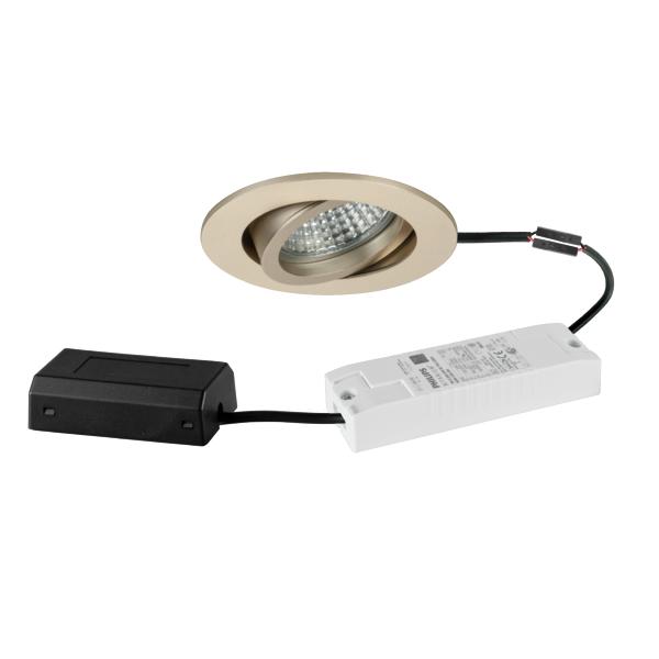 LED-Einbaustrahlerset, DALI dimmbar, mit Anschlussbox, champagner matt, rund. Ausgeführt in kompakter Bauform für werkzeuglose Schnellmontage zum Deckeneinbau. Set inkl. Konverter für 230 V-Netzspannung, DALI-2 dimmbar, ohne Nachglimm-Effekt, Maße Konverter: L 130 x B 42 x H 22 mm Montageart: Einbaumontage, Montageort: Deckenmontage, Material: Aluminium / Glas / Kunststoff, Schutzart raumseitig: nach DIN EN 60529: IP20, Schutzklasse: (EN 61140) II, Spannung: 230V AC 50Hz, Leistung: 6 W, Anzahl der Leuchtmittel / Fassungen: 1 Stück, Lichtstrom: 730 lm, Farbtemperatur: 3.000 K, Abstrahlwinkel: 38°, Verstellbarkeit: schwenkbar, Mit Betriebsgerät: Ja, Dimmbar: Ja, Art der Dimmung: DALI-2.