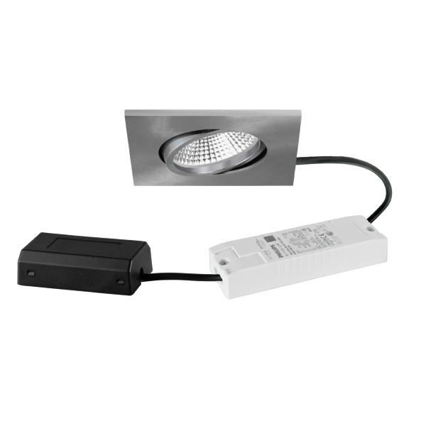 LED-Einbaustrahlerset, IP65, DALI dimmbar, mit Anschlussbox, nickel matt, quadratisch. Ausgeführt in kompakter Bauform für werkzeuglose Schnellmontage zum Deckeneinbau. Set inkl. Konverter für 230 V-Netzspannung, DALI-2 dimmbar, Maße Konverter: L 130 x B 42 x H 22 mm Ausführung: ohne Fassung, Montageart: Einbaumontage, Montageort: Deckenmontage, Material: Aluminium / Silikonkautschuk / PMMA, Schutzart raumseitig: nach DIN EN 60529: IP65, Schutzklasse: (EN 61140) II, Spannung: 230V AC 50Hz, Leistung: 7 W, Anzahl der Leuchtmittel / Fassungen: 1 Stück, Lichtstrom: 620 lm, Farbtemperatur: 3.000 K, Abstrahlwinkel: 36°, Verstellbarkeit: schwenkbar, Mit Betriebsgerät: Ja, Dimmbar: Ja, Art der Dimmung: DALI-2.- Hersteller-Artikelnummer (MPN)