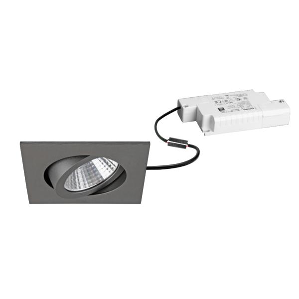 LED-Einbaustrahlerset, Phasenabschnitt dimmbar, titan matt, quadratisch. Ausgeführt in kompakter Bauform für werkzeuglose Schnellmontage zum Deckeneinbau. Set inkl. Konverter für 230 V-Netzspannung, Phasenabschnitt, Maße Konverter: L 110 x B 50 x H 19 mm Ausführung: ohne Fassung, Montageart: Einbaumontage, Montageort: Deckenmontage, Material: Aluminium / Polycarbonat, Schutzart raumseitig: nach DIN EN 60529: IP20, Schutzklasse: (EN 61140) II, Spannung: 230V AC 50Hz, Leistung: 7 W, Anzahl der Leuchtmittel / Fassungen: 1 Stück, Lichtstrom: 740 lm, Farbtemperatur: 2.700 K, Abstrahlwinkel: 38°, Verstellbarkeit: schwenkbar, Mit Betriebsgerät: Ja, Dimmbar: Ja, Art der Dimmung: Phasenabschnitt.