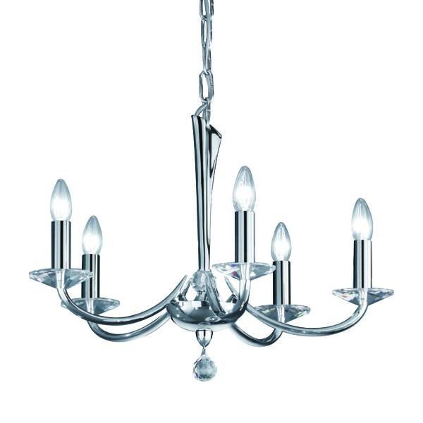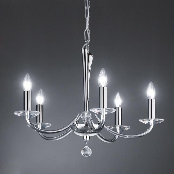 Pendelleuchte chrom glänzend, mit Kristallen, chrom glänzend, sonstige. Ausführung in kompakter Bauform für die harmonische Implementierung in stimmige, architektonische Raumkonzepte. Anbau-Pendelleuchte, mit Kristallen. Ausführung: E14, Montageart: Anbaumontage, Montageort: Deckenmontage, Material: Messingguss / Kristall, Schutzart raumseitig: nach DIN EN 60529: IP20, Schutzklasse: (EN 61140) I, Spannung: 230V AC 50Hz, Leistung: 40 W, Anzahl der Leuchtmittel / Fassungen: 5 Stück, ohne Betriebsgerät, Art der Dimmung: sonstige.