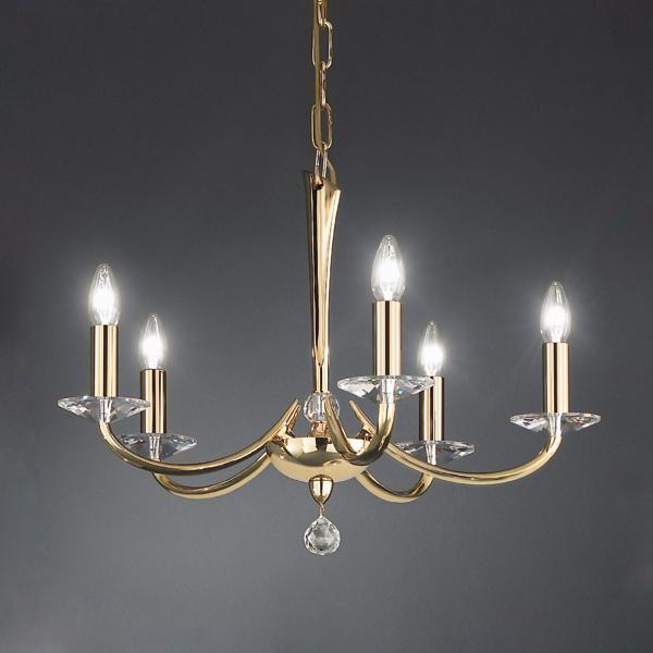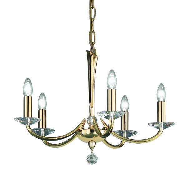 Pendelleuchte gold glänzend, mit Kristallen, gold glänzend, sonstige. Ausführung in kompakter Bauform für die harmonische Implementierung in stimmige, architektonische Raumkonzepte. Anbau-Pendelleuchte, mit Kristallen. Ausführung: E14, Montageart: Anbaumontage, Montageort: Deckenmontage, Material: Messingguss / Kristall, Schutzart raumseitig: nach DIN EN 60529: IP20, Schutzklasse: (EN 61140) I, Spannung: 230V AC 50Hz, Leistung: 40 W, Anzahl der Leuchtmittel / Fassungen: 5 Stück, ohne Betriebsgerät, Art der Dimmung: sonstige.