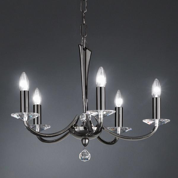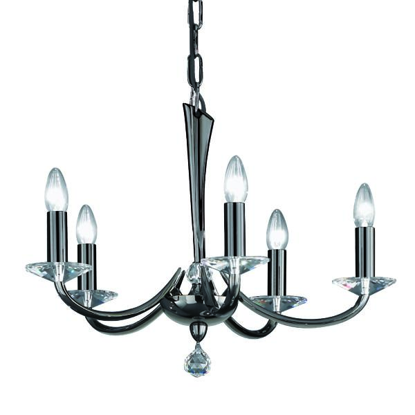 Pendelleuchte schwarzchrom glänzend, mit Kristallen, schwarzchrom glänzend, sonstige. Ausführung in kompakter Bauform für die harmonische Implementierung in stimmige, architektonische Raumkonzepte. Anbau-Pendelleuchte, mit Kristallen. Ausführung: E14, Montageart: Anbaumontage, Montageort: Deckenmontage, Material: Messingguss / Kristall, Schutzart raumseitig: nach DIN EN 60529: IP20, Schutzklasse: (EN 61140) I, Spannung: 230V AC 50Hz, Leistung: 40 W, Anzahl der Leuchtmittel / Fassungen: 5 Stück, ohne Betriebsgerät, Art der Dimmung: sonstige.