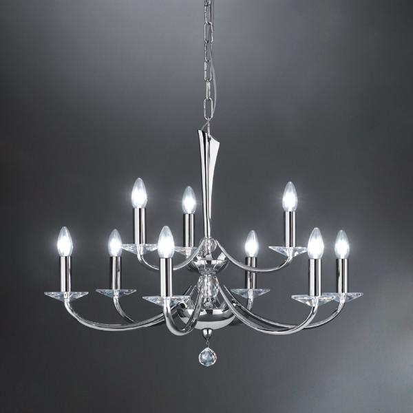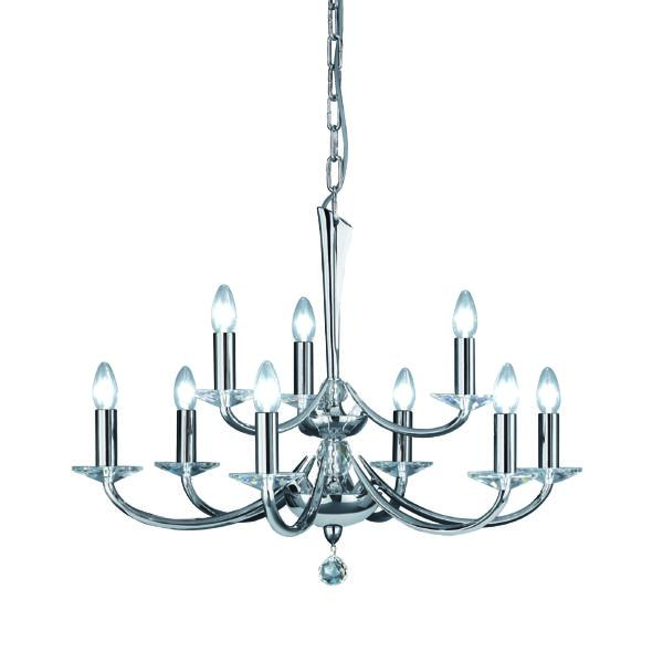 Pendelleuchte chrom glänzend, mit Kristallen, chrom glänzend, sonstige. Ausführung in kompakter Bauform für die harmonische Implementierung in stimmige, architektonische Raumkonzepte. Anbau-Pendelleuchte, mit Kristallen. Ausführung: E14, Montageart: Anbaumontage, Montageort: Deckenmontage, Material: Messingguss / Kristall, Schutzart raumseitig: nach DIN EN 60529: IP20, Schutzklasse: (EN 61140) I, Spannung: 230V AC 50Hz, Leistung: 40 W, Anzahl der Leuchtmittel / Fassungen: 9 Stück, ohne Betriebsgerät, Art der Dimmung: sonstige.
