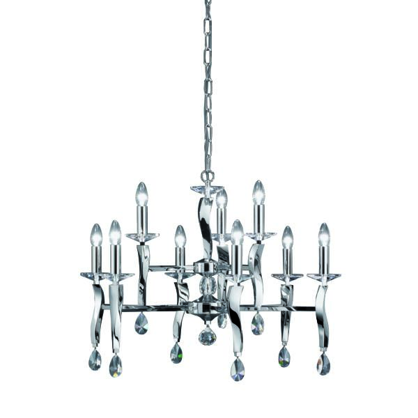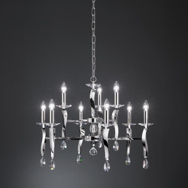 Pendelleuchte chrom glänzend, mit Kristallen, chrom glänzend, sonstige. Ausführung in kompakter Bauform für die harmonische Implementierung in stimmige, architektonische Raumkonzepte. Anbau-Pendelleuchte, mit Kristallen. Ausführung: E14, Montageart: Anbaumontage, Montageort: Deckenmontage, Material: Messingguss / Kristall, Schutzart raumseitig: nach DIN EN 60529: IP20, Schutzklasse: (EN 61140) I, Spannung: 230V AC 50Hz, Leistung: 40 W, Anzahl der Leuchtmittel / Fassungen: 9 Stück, ohne Betriebsgerät, Art der Dimmung: sonstige.