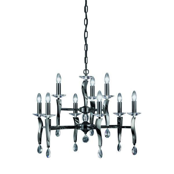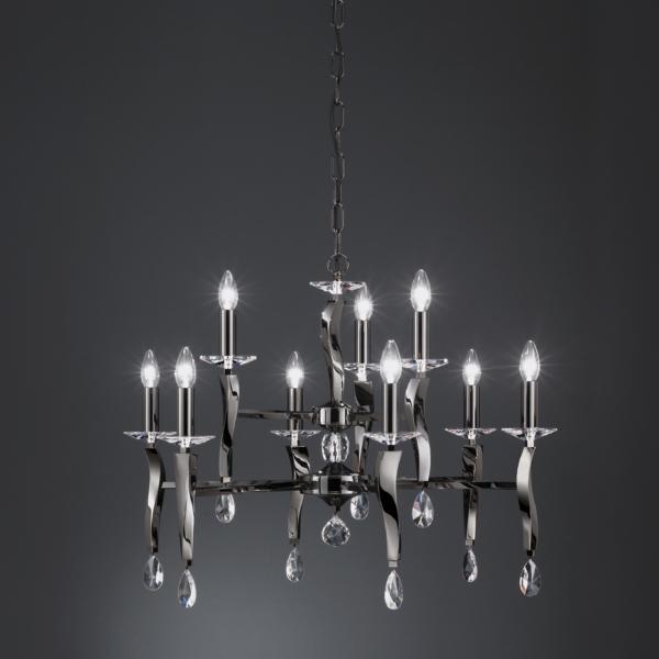 Pendelleuchte schwarzchrom glänzend, mit Kristallen, schwarzchrom glänzend, sonstige. Ausführung in kompakter Bauform für die harmonische Implementierung in stimmige, architektonische Raumkonzepte. Anbau-Pendelleuchte, mit Kristallen. Ausführung: E14, Montageart: Anbaumontage, Montageort: Deckenmontage, Material: Messingguss / Kristall, Schutzart raumseitig: nach DIN EN 60529: IP20, Schutzklasse: (EN 61140) I, Spannung: 230V AC 50Hz, Leistung: 40 W, Anzahl der Leuchtmittel / Fassungen: 9 Stück, ohne Betriebsgerät, Art der Dimmung: sonstige.