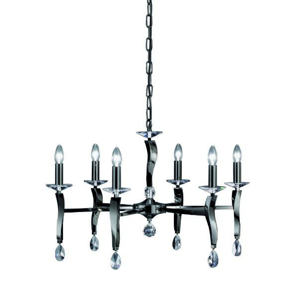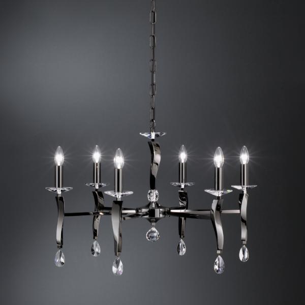Pendelleuchte schwarzchrom glänzend, mit Kristallen, schwarzchrom glänzend, sonstige. Ausführung in kompakter Bauform für die harmonische Implementierung in stimmige, architektonische Raumkonzepte. Anbau-Pendelleuchte, mit Kristallen. Ausführung: E14, Montageart: Anbaumontage, Montageort: Deckenmontage, Material: Messingguss / Kristall, Schutzart raumseitig: nach DIN EN 60529: IP20, Schutzklasse: (EN 61140) I, Spannung: 230V AC 50Hz, Leistung: 40 W, Anzahl der Leuchtmittel / Fassungen: 6 Stück, ohne Betriebsgerät, Art der Dimmung: sonstige.