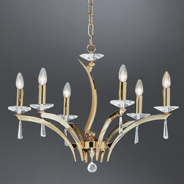 Pendelleuchte gold glänzend, mit Kristallen, gold glänzend, sonstige. Ausführung in kompakter Bauform für die harmonische Implementierung in stimmige, architektonische Raumkonzepte. Anbau-Pendelleuchte, mit Kristallen. Ausführung: E14, Montageart: Anbaumontage, Montageort: Deckenmontage, Material: Messingguss / Kristall, Schutzart raumseitig: nach DIN EN 60529: IP20, Schutzklasse: (EN 61140) I, Spannung: 230V AC 50Hz, Leistung: 40 W, Anzahl der Leuchtmittel / Fassungen: 6 Stück, ohne Betriebsgerät, Art der Dimmung: sonstige.
