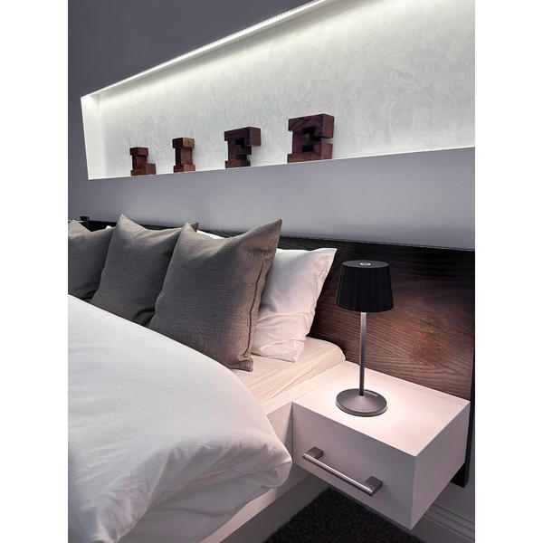LED-Akkutischleuchte, Touchdim, IP54, Höhe 285 mm, strukturschwarz. Ausführung in kompakter Bauform für die harmonische Implementierung in stimmige, architektonische Raumkonzepte. Ausführung: ohne Fassung, Montageart: Anbaumontage, Montageort: Tischmontage, Material: Aluminium / Glas / Kunststoff, Schutzart raumseitig: nach DIN EN 60529: IP54, Schutzklasse: (EN 61140) III, Leistung: 4,8 W, Anzahl der Leuchtmittel / Fassungen: 1 Stück, Lichtstrom: 150 lm, Lichtfarbe: weiß, Mit Betriebsgerät: Ja, Dimmbar: Ja, Art der Dimmung: sonstige.