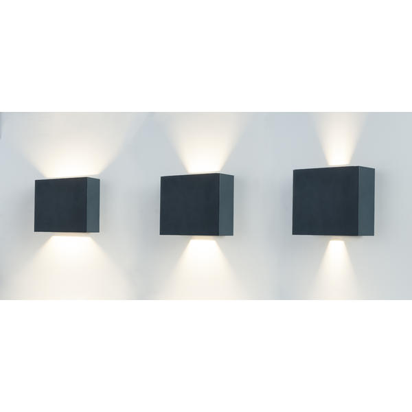 LED-Wandanbauleuchte, IP54, schaltbar, strukturgraphit, rechteckig. Ausführung in kompakter Bauform für die harmonische Implementierung in stimmige, architektonische Raumkonzepte. Lichtaustritt direkt und indirekt. Wandanbauleuchte mit schraubenlos übergeschobenem Außengehäuse. Jeweils zwei Klappen ober- und unterseitig zum variabel einstellbaren Lichtaustritt des jeweiligen Lichtkegels. Abstrahlwinkel 2 x max. 100°. Ausführung: ohne Fassung, Montageart: Anbaumontage, Montageort: Wandmontage, Material: Aluminium / Glas, Schutzart raumseitig: nach DIN EN 60529: IP54, Schutzklasse: (EN 61140) I, Spannung: 230V AC 50Hz, Leistung: 6 W, Anzahl der Leuchtmittel / Fassungen: 2 Stück, Lichtstrom: 424 lm, Farbtemperatur: 3.000 K, Abstrahlwinkel: 100°, Mit Betriebsgerät: Ja, Art der Dimmung: schaltbar.- Hersteller-Artikelnummer (MPN)