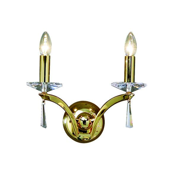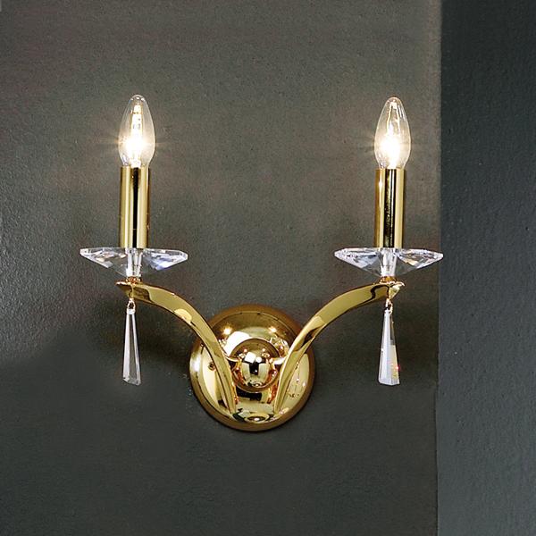 Wandleuchte gold glänzend, mit Kristallen, gold glänzend, sonstige. Ausführung in kompakter Bauform für die harmonische Implementierung in stimmige, architektonische Raumkonzepte. Wandanbauleuchte, mit Kristallen. Ausführung: E14, Montageart: Anbaumontage, Montageort: Wandmontage, Material: Messingguss / Kristall, Schutzart raumseitig: nach DIN EN 60529: IP20, Schutzklasse: (EN 61140) I, Spannung: 230V AC 50Hz, Leistung: 40 W, Anzahl der Leuchtmittel / Fassungen: 2 Stück, ohne Betriebsgerät, Art der Dimmung: sonstige.- Hersteller-Artikelnummer (MPN)