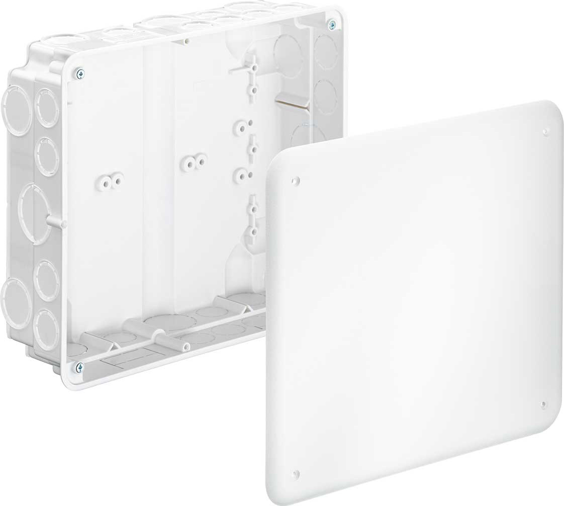 Verbindungskasten mit Deckel, 238 x 208 x 68 mm, halogenfrei (1097-92). Unterputz-Verbindungskästen in allen Größen und für fast alle Aufgaben. Dieses Programm zeichnet sich durch seine praxisnahen Gehäusegrößen sowie die baustellengerechte, robuste Bauart der Gehäuse aus. Installationsart: Basis-Installation | Tiefe: 68 mm | Anwendungsgebiet: Für Leitungsverbindungen | Länge: 238 mm | Breite: 208 mm