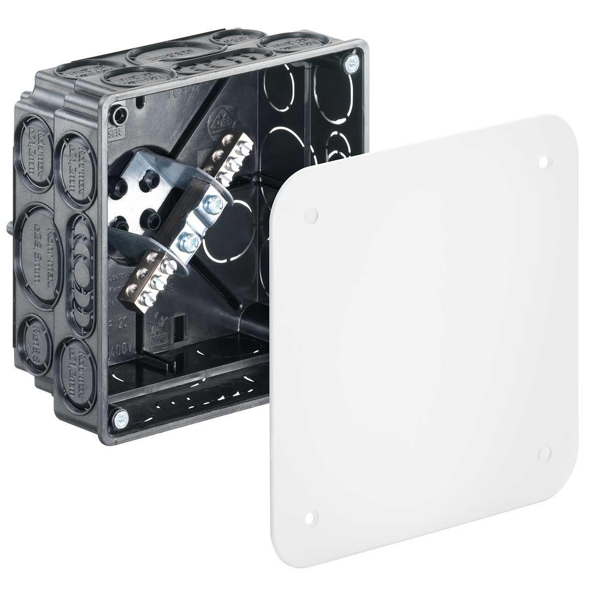Potentialausgleich-Kasten 10² mit Deckel, 107 x 107 x 57 mm (1095-73). Unterputz-Verbindungskästen in allen Größen und für fast alle Aufgaben. Dieses Programm zeichnet sich durch seine praxisnahen Gehäusegrößen sowie die baustellengerechte, robuste Bauart der Gehäuse aus. Installationsart: Basis-Installation | Anwendungsgebiet: Für Leitungsverbindungen | Länge: 107 mm | Breite: 107 mm | Tiefe: 57 mm | Anwendungsgebiet: Potentialausgleich