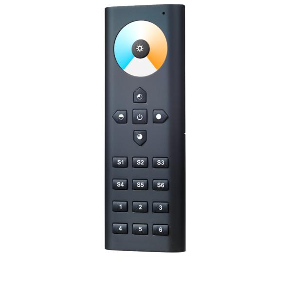TunableWhite-Funkfernbedienung zu 18192000, schwarz. TunableWhite-Funkfernbedienung zur Ansteuerung von zweifarbigen LED-Modulen im Weißlichtbereich. Spannung (Batterie): 4,5 V DC - 3 x AAA (nicht im Lieferumfang), Funkfrequenz: 869,5 MHz, Sendeleistung (Ps) < 0 dBm, Reichweite (Sichtverbindung): bis zu 20 m, Umgebungstemperatur (ta): 0 °C bis +40 °C, Maße: L 140 x B 48 x H 17 mm, Material: Kunststoff, Lieferung: inkl. Wandhalterung Funktionsumfang: - Ein / Aus - Lichtfarbwechsel über Touchwheel - Dimmung der eingestellten Lichtfarbe - Speichertasten S1 bis S6 - Wahltasten 25 % / 50 % / 75 % / 100 % Helligkeit - Controllerauswahltasten für Zone 1 bis 6 Kompatibel zu Funk-Master-Controller 18192000, weitere Funktionen entnehmen Sie bitte der Produktbeschreibung. Schutzart raumseitig: nach DIN EN 60529: IP20.- Hersteller-Artikelnummer (MPN)