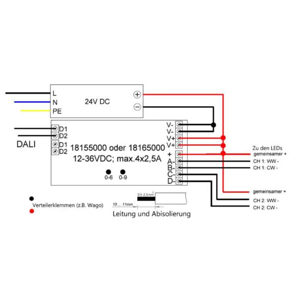 LED-Dimmer 12-24 V DC, dimmbar, schwarz. LED-Dimmer-Serie für Konstantspannungsbetrieb (12-24 V DC) über 4 Kanäle (ein- oder mehrfarbig). Die Verkabelung erfolgt schraublos über Steckklemmen. Leitungsquerschnitt: 0,5-2,5 mm². Zum Betrieb wird eine externe Spannungsversorgung benötigt, Ausgangssignal (Dimmung): PWM (Pulsweitenmodulation), mit Verpolungs- und Übertemperaturschutz. Max. Ausgangsstrom: 10 A (4 x 2,5 A: 3 x 3,33 A: 2 x 5 A: 1 x 5 A) Max. Ausgangsleistung 12 V: 120 W (4 x 30 W: 3 x 40 W: 2 x 60 W: 1 x 60 W) Max. Ausgangsleistung 24 V: 240 W (4 x 60 W: 3 x 80 W: 2 x 120 W: 1 x 120 W) Material: Kunststoff, Schutzart raumseitig: nach DIN EN 60529: IP20, Schutzklasse: (EN 61140) III, Spannung: 12V 24V, Leistung: 240 W, Art der Dimmung: DALI-2.
