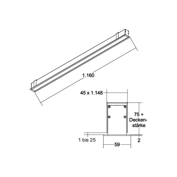LED-Einbauprofil, weiß, rechteckig. Ausgeführt in kompakter Bauform für werkzeuglose Schnellmontage zum Deckeneinbau. LED-Lichtkanal mit microprismatischer Abdeckung. Ausführung: ohne Fassung, Montageart: Einbaumontage, Montageort: Deckenmontage, Material: Aluminium / Acryl, Schutzart raumseitig: nach DIN EN 60529: IP20, Schutzklasse: (EN 61140) I, Spannung: 230V AC 50Hz, Leistung: 35,8 W, Lichtstrom: 2.860 lm, Farbtemperatur: 3.000 K, Lichtfarbe: weiß, Abstrahlwinkel: 80°, Verstellbarkeit: nicht verstellbar, Mit Betriebsgerät: Ja, Art der Dimmung: DALI-DT6.- Hersteller-Artikelnummer (MPN)