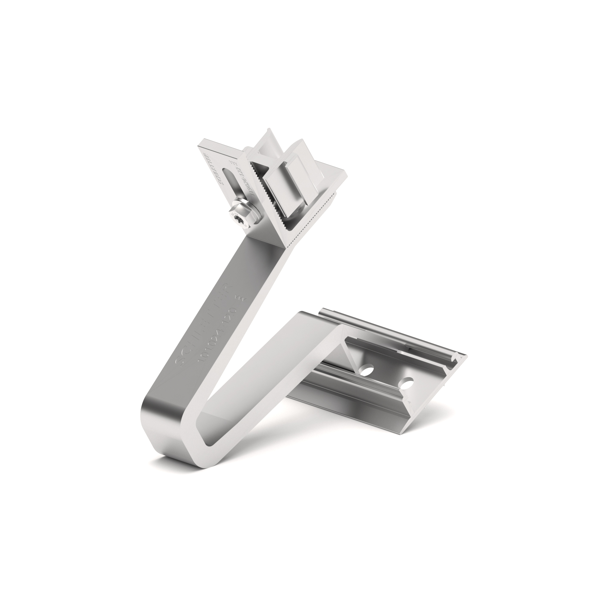 Der Dachhaken aus Aluminium deckt einen Großteil der Anwendungen auf Ziegeldächern ab und ist für höhere Schneelasten und Windlasten geeignet. Er ermöglicht eine schnelle und flexible Montage durch Einhaken, und wird mit nur einer Tellerkopfschraube mit TX befestigt. Es wird die Anschraubplatte am Sparren montiert und der Bügel wird anschließend eingeklickt. Durch einen drehbaren Multiadapter kann der Dachhaken mit den Profilen der Serie ProLine sowie mit dem klassischen Schletter Baukastensystem kombiniert werden und besitzt am oberen, drehbaren Anschluss eine Höhenverstellung sowie einen entsprechenden Schnellmontageadapter.
