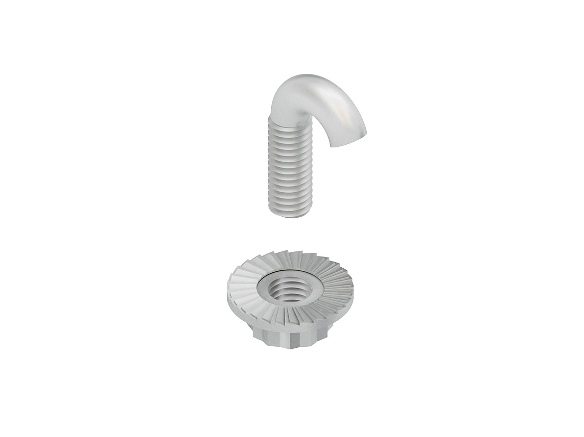 Hakenschraube mit Gewinde M 6, einschließlich verzahnter Sonderflanschmutter ähnlich DIN EN 1661, zur Befestigung der Gitterrinnen auf Ausleger, an Gitterrinnen-Hängestiele, sowie an Gelenkverbinder. Verwendbar für : Gitterrinnen bis max. 6 mm Drahtstärke Abmessungen (ca. Maße) Gewinde : M 6 Gewindelänge : 15 mm Flanschmutter : Ø 16 mm Werkstoff : Edelstahl, Werkstoff Nr. 1.4301, AISI 304