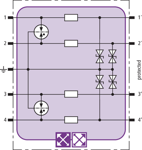Platzsparendes Kombiableiter-Modul mit LifeCheck zum Schutz von 4 Einzeladern mit gemeinsamem Bezugspotential sowie unsymmetrischer Schnittstellen. LifeCheck erkennt thermische oder elektrische Überlastzustände nach denen der Ableiter auszutauschen ist. Die Anzeige erfolgt berührungslos mittels DEHNrecord LC / SCM / MCM.