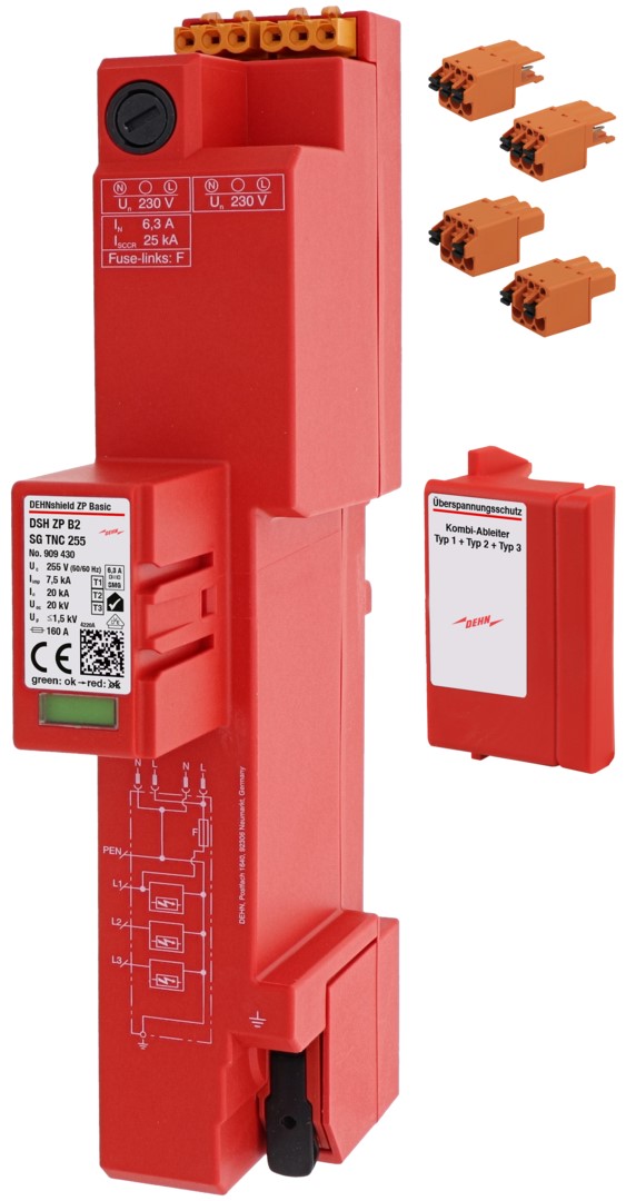 Geprüfter Kombi-Ableiter Typ 1+Typ 2+Typ 3 nach DIN EN 61643-11 für TN-C-Systeme (3+0-Schaltung) inkl. überstromgeschützter 230 V Spannungsversorgung (N und L) inkl. Ersatzsicherung jeweils für RfZ / APZ gem. VDE-AR-N 4100; komplett werkzeuglos montierbar durch Click+Power-Anschlusstechnik für das 40 mm Sammelschienensystem und Push-in Erdungsklemme; Zum Einsatz im Hauptstromversorgungssystem nach DIN VDE 0100-443 bei Gebäuden (auch mit Freileitungseinspeisung, ohne äußeres Blitzschutzsystem). Ein passender Abdeck-Clip nach DIN VDE 0603-1 für jedes handelsübliche Zählerfeld, plus 2 x Buchse und 2 x Stecker (ohne Anschlussleitungen) zur Verdrahtung des intelligenten Messsystems nach VDE-AR 4100 ist im Lieferumfang enthalten.