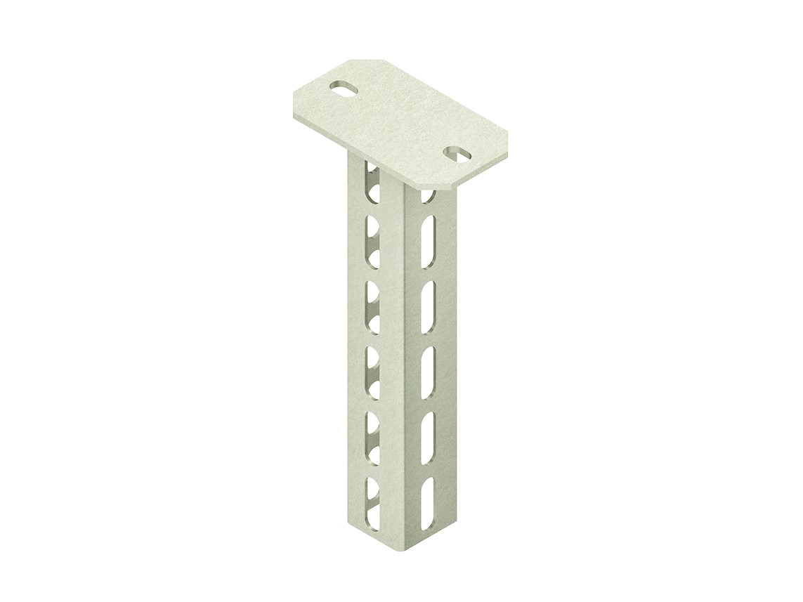 Hängestiel, 3-seitig durchgehend gelochtes U-Profil mit angeschweißter Kopfplatte, System HU 5050/..., für Ausleger zur ein-/zwei- und dreiseitigen Verlegung, um die Verformung des Hängestielprofils bei der Montage von Ausleger zu verhindern, ist aus statischen Gründen das Hängestiel-Distanzprofil HDS 50.50 F mit Sechskantschraube zu berücksichtigen, bei einer einseitigen Befestigung des Auslegers am Hängestielprofil ist bevorzugt die geschlossene Seite des Auslegers fluchtend mit dem Profilsteg des Hängestiels anzubringen. Aus statischen Gründen und um ein problemloses Aufsetzen der Schutzkappe zu ermöglichen, muss der Ausleger im Abstand von x=50 mm (Auslegerunterkante bis Hängestielende), oberhalb des Hängestielendes montiert werden. Zur Verwendung im Funktionserhalt bzw. für Unterdecken mit brandschutztechnischen Anforderungen (Muster-Leitungsanlagen-Richtlinie MLAR 2/2015) bitte Zusatzvorschriften beachten! VDE zertifiziert! für Ausleger : KTAL... KTAM... KTA... für Ausleger : KTAS 100 - 400 (Funktionserhalt/KFO) für Ausleger : KTA 100 - 600 (Funktionserhalt/MLAR) Abmessungen (ca. Maße) Kopfplatte L x B x t : 140 x 80 x 5 mm Befestigungslochung : 13 x 20 mm mittiger Abstand : 100 mm U-Profil : 50 x 50 x 50 mm Materialstärke t : 2,5 mm dreiseitige Profillochung, einreihig : 12 x 30 mm mittiger Abstand : 50 mm Gesamtlänge L : 305 mm Werkstoff : Stahl, tauchfeuerverzinkt nach DIN EN ISO 1461