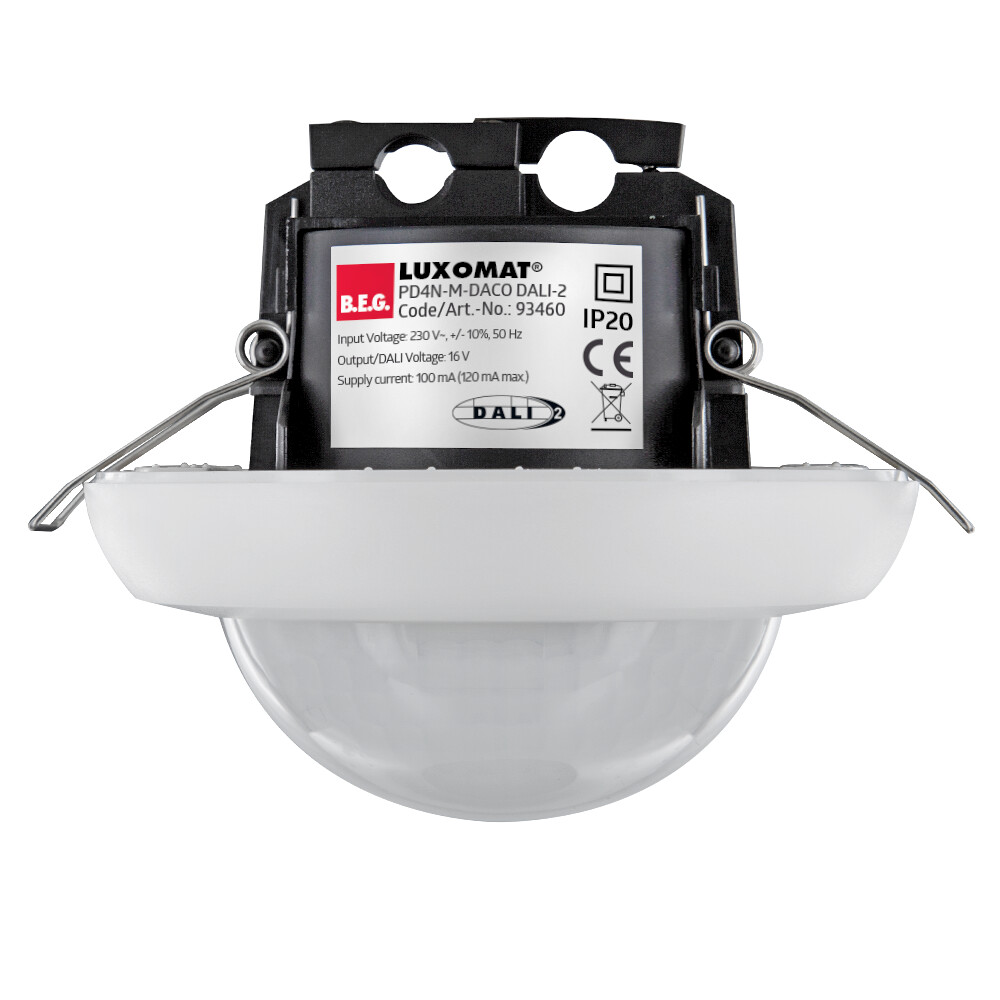 Präsenzmelder mit integriertem DALI-Applikations-Controller für eine energieeffiziente Lichtsteuerung, DALI-2 zertifiziertes Produkt, Integrierte DALI-Spannungsversorgung, DALI-Schnittstelle zur Ansteuerung digitaler, dimmbarer EVG im Broadcast-Verfahren, Manuelles Schalten und Dimmen über konventionelle Taster möglich, Bidirektionale IR-Kommunikation ermöglicht schnelle Integration in die Projektverwaltungsfunktion der B.E.G. One App, Voller Funktionsumfang ist nur mit dem BLE-IR-Adapter und einem Smartphone oder Tablet (Android, iOS) aktivierbar, Halbautomatik-, Vollautomatik-, Lichtregler- oder Anwesenheits-Betrieb einstellbar, Intelligenter Regelalgorithmus mit umfangreichen Einstellmöglichkeiten, Software ist rückwärtskompatibel zur ersten Generation (außer DSI, Doppelschloss und Korridorfunktion), Werkseinstellung 10 min Nachlaufzeit und 500 Lux Helligkeitssollwert, Inklusive vormontierter Federklemme mit Zugentlastung und Berührschutzkappe für die Deckeneinbau-Montage, Zubehör für Aufputzmontage optional erhältlich, Zubehör für Wandmontage optional erhältlich, Weiteres Zubehör zur Farbanpassung optional erhältlich