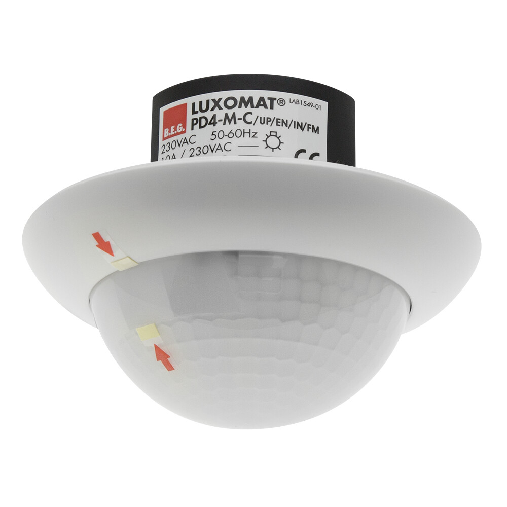 Präsenzmelder speziell für Korridore, Ein Kanal zum Schalten von Licht, Ein zusätzlicher potentialfreier Kontakt für HKL, Ausführung als Master-Gerät, Erweiterung des Erfassungsbereiches mit Slave-Geräten möglich, Manuelles Schalten über Taster möglich, Alarmimpuls: Auslösen erst bei drei erkannten Bewegungen innerhalb von 9 Sekunden, Weitere Funktionen über optionale Fernbedienung einstellbar, Für die Ausrichtung des Melders sind Markierungen vorhanden, Werkseinstellung 10 min und 500 Lux (15 min HKL)