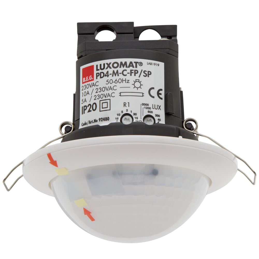 Präsenzmelder mit NO-Kontakt und Sicherheitsschaltung durch NC-Kontakt, Gewährleistet Beleuchtung auch bei Ausfall des Melders, Speziell für Korridore, Ausführung als Master-Gerät, Erweiterung des Erfassungsbereiches mit Slave-Geräten möglich, Manuelles Schalten über Taster möglich, Weitere Funktionen über optionale Fernbedienung einstellbar, Werkseinstellung 10 min und 500 Lux, Für die Ausrichtung des Melders sind Markierungen vorhanden