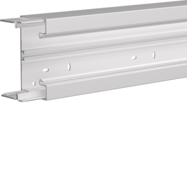 Brüstungskanal-Unterteil frontrastend hfr zu BRH 68x130mm Oberteil 80mm vw.Kanalunterteil zum Elektro-Installationskanal-System Brüstungskanal aus halogenfreiem Kunststoff nach DIN EN 50085-1 als Geräteeinbaukanal mit Oberteilbreite 80 mm zum Einbau handelsüblicher Geräte ohne Zusatzblenden. Halogenfreier Kunststoff ist flammwidrig und entwickelt in Verbindung mit Feuchtigkeit, z.B. Löschwasser, keine korrosiven Brandgase. Somit sind elektronische Geräte und Sachwerte besser geschützt. Mit Bodenlochung (allseitiger Bohrtolleranzausgleich) zur direkten Wandmontage und zusätzlicher Rechtecklochung zur werkzeuglosen Befestigung des Kanals mittels Clip-Technik auf Konsolen. Mit frontrastendem, werkzeuglosem Geräteeinbau zur Befestigung von Geräten und Geräteeinbaudosen mit Schnellbefestigung. Zusätzliches C-Profil als Geräteeinbaumöglichkeit. Kupplungen zur einfachen und passgenauen Kanalmontage, Trennwände und Leitungsrückhalteklammern als Zubehör erhältlich. Hinweis: Schall- und Brandschutz-Maßnahmen sind fachgerecht auszuführen.