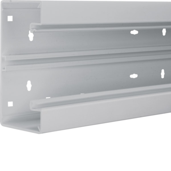 Brüstungskanal-Unterteil PVC frontrastend BR 68x170mm Oberteil 80mm in lichtgrau.Kanalunterteil zum Elektro-Installationskanal-System Brüstungskanal aus Kunststoff nach DIN EN 50085-1 als Geräteeinbaukanal mit Oberteilbreite 80 oder 120 mm zum Einbau handelsüblicher Geräte ohne oder mit Zusatzblenden. Mit Bodenlochung (allseitiger Bohrtolleranzausgleich) zur direkten Wandmontage und zusätzlicher Rechtecklochung zur werkzeuglosen Befestigung des Kanals mittels Clip-Technik auf Konsolen. Bei Oberteilbreite 80 mm mit frontrastendem, werkzeuglosem Geräteeinbau zur Befestigung von Geräten und Geräteeinbaudosen mit Schnellbefestigung - zusätzliches C-Profil als Geräteeinbaumöglichkeit wie bei allen Kanälen mit Oberteilbreite 120 mm. Kupplungen zur einfachen und passgenauen Kanalmontage, Trennwände und Leitungsrückhalteklammern als Zubehör erhältlich. Hinweis: Schall- und Brandschutz-Maßnahmen sind fachgerecht auszuführen.