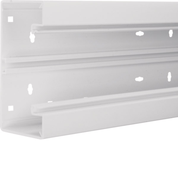 Brüstungskanal-Unterteil PVC frontrastend zu BR 68x170mm OT 80mm in verkehrsweiß.Kanalunterteil zum Elektro-Installationskanal-System Brüstungskanal aus Kunststoff nach DIN EN 50085-1 als Geräteeinbaukanal mit Oberteilbreite 80 oder 120 mm zum Einbau handelsüblicher Geräte ohne oder mit Zusatzblenden. Mit Bodenlochung (allseitiger Bohrtolleranzausgleich) zur direkten Wandmontage und zusätzlicher Rechtecklochung zur werkzeuglosen Befestigung des Kanals mittels Clip-Technik auf Konsolen. Bei Oberteilbreite 80 mm mit frontrastendem, werkzeuglosem Geräteeinbau zur Befestigung von Geräten und Geräteeinbaudosen mit Schnellbefestigung - zusätzliches C-Profil als Geräteeinbaumöglichkeit wie bei allen Kanälen mit Oberteilbreite 120 mm. Kupplungen zur einfachen und passgenauen Kanalmontage, Trennwände und Leitungsrückhalteklammern als Zubehör erhältlich. Hinweis: Schall- und Brandschutz-Maßnahmen sind fachgerecht auszuführen.