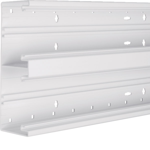 Brüstungskanal-Unterteil PVC frontrastend BR 68x210mm OT 2x80mm in verkehrsweiß.Kanalunterteil zum Elektro-Installationskanal-System Brüstungskanal aus Kunststoff nach DIN EN 50085-1 als Geräteeinbaukanal mit Oberteilbreite 80 mm zum Einbau handelsüblicher Geräte ohne Zusatzblenden. Mit fester Zwischenwand zur Systemtrennung. Mit Bodenlochung (allseitiger Bohrtolleranzausgleich) zur direkten Wandmontage und zusätzlicher Rechtecklochung zur werkzeuglosen Befestigung des Kanals mittels Clip-Technik auf Konsolen. Mit frontrastendem, werkzeuglosem Geräteeinbau zur Befestigung von Geräten und Geräteeinbaudosen mit Schnellbefestigung. Zusätzliches C-Profil als Geräteeinbaumöglichkeit. Kupplungen zur einfachen und passgenauen Kanalmontage, Trennwände und Leitungsrückhalteklammern als Zubehör erhältlich. Hinweis: Schall- und Brandschutz-Maßnahmen sind fachgerecht auszuführen.