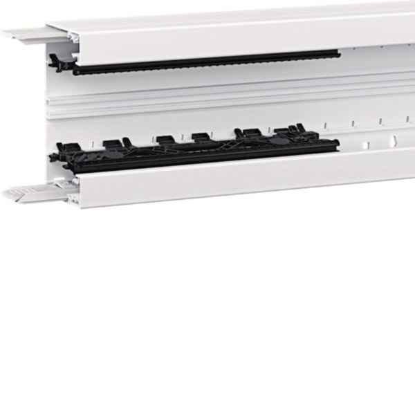 Brüstungskanal-Unterteil Profil Geräteeinbau BRN 68x130mm aus PVC in vweiß.Kanalunterteil zum Elektro-Installationskanal-System Brüstungskanal aus Kunststoff nach DIN EN 50085-1 als Geräteeinbaukanal mit Oberteilbreite 80 mm, abnehmbare Seitenoberteile zur einfachen und schnellen Leitungsverlegung sowie Nachbelegung. Systemträger zur Teilung des Grundprofils in drei separate Bereiche: zwei getrennte Leitungsführungskammern sowie einen Geräteeinbaubereich. Mit Bodenlochung (allseitiger Bohrtolleranzausgleich) zur direkten Wandmontage und zusätzlicher Rechtecklochung zur werkzeuglosen Befestigung des Kanals mittels Clip-Technik auf Konsolen. Mit frontrastendem, werkzeuglosem Geräteeinbau zur Befestigung von Geräten und Geräteeinbaudosen mit Schnellbefestigung. Zusätzliches C-Profil als Geräteeinbaumöglichkeit. Kupplungen zur einfachen und passgenauen Kanalmontage, Trennwände und Leitungsrückhalteklammern als Zubehör erhältlich. Hinweis: Schall- und Brandschutz-Maßnahmen sind fachgerecht auszuführen.