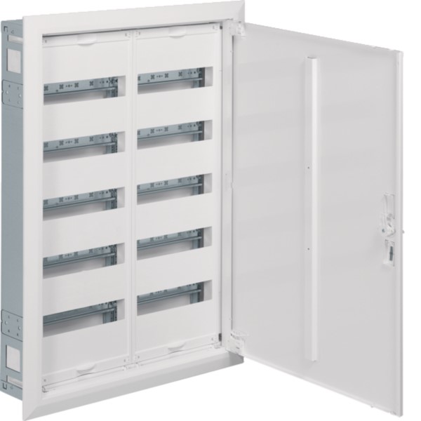 Feldverteiler UP/HW entspricht DIN EN 61 439-1/-3 und DIN 43870, für Geräteeinbau bis 125 A. Ausgestattet mit SKII Berührungsschutz und IP30 Schutzart. Features: pulverbeschichtete Stahlblechtür in RAL 9010, Tragschienen, Hutschienen, QuickConnect-Klemmblöcke für PE und N, sowie variable Leitungseinführungen und plombierbarer Türverschluss.