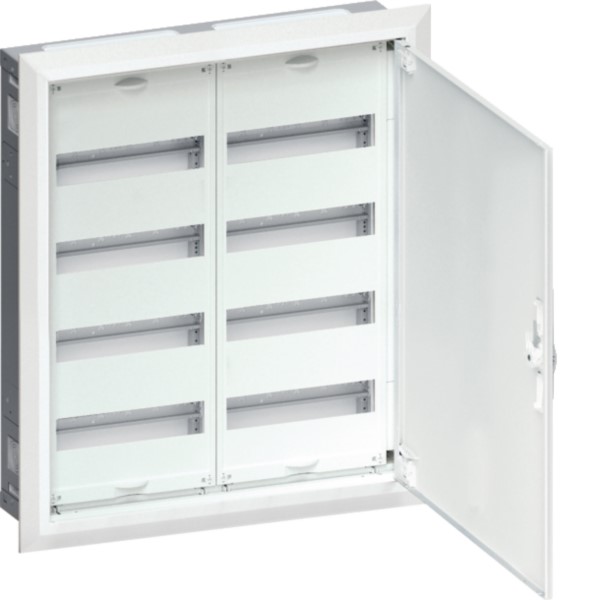 Feldverteiler UP/HW entspricht DIN EN 61 439-1/-3 und DIN 43870, geeignet für Geräte bis 125 A. Schutzart IP30 mit Luft- und Kriechstrecken gemäß DIN EN 60664-1. Ausstattung umfasst pulverbeschichteten Schrank in RAL 9010, Tragschienen, Hutschienen, Berührungsschutz (SKII), QuickConnect-Klemmblöcke für PE/N, sowie herausnehmbare Flanschplatten. Türen mit verstellbaren Scharnieren und variablem Türanschlag bieten Flexibilität bei der Montage.