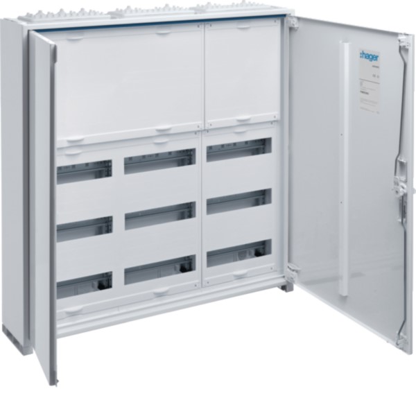 Feldverteiler nach DIN EN 61 439-1/-3! Geräte bis 125 A mit Luft- und Kriechstreckenschutz DIN EN 60664-1. Der Schrank ist in verschiedenen Breiten erhältlich, ab 800 mm mit Zwei-Tür-Konstruktion. Profilierte Tragschienen, 15 mm Hutschienen für Reihenklemmen in 150mm Abstand, 7,5 mm Hutschienen in 150 mm Mittenabstand und Berührungsschutzabdeckungen in den unteren Reihen. Flexible Kunststoffflanschplatten oben und unten.
