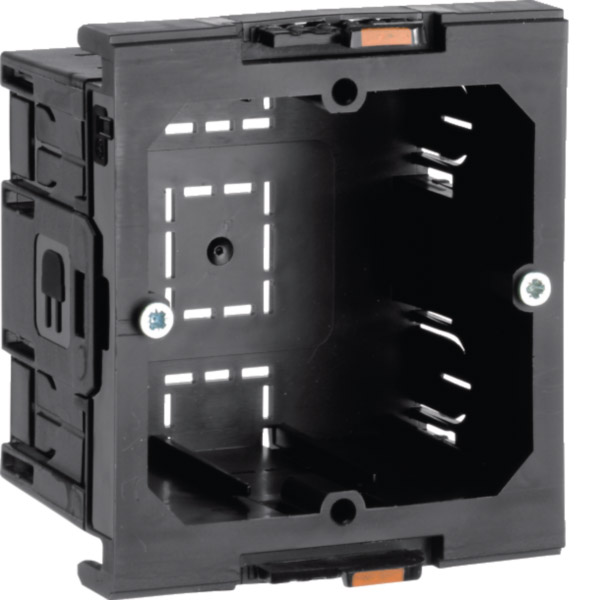 Geräteeinbaudose 1-fach Energie für BR Frontrastend für Schalterprogramme.Geräteeinbaudose für Brüstungskanal mit Frontrastender Gerätemontage, modular anreihbar, erhöhte Einbautiefe zum bündigen Abschluß mit dem Oberteil des Brüstungskanals, vertikaler und horizontaler Geräteeinbau möglich. Gerätehalteschrauben in Schnellgewindeausführung. Fixieren und leichtes Umpositionieren durch werkzeuglose mechanische Verriegelung im Brüstungskanal möglich. Zur Aufnahme von Installationsgeräten bis 250 V / 16 A mit Tragringen und Befestigungsspur 60 mm. Zur Verwendung mit Rahmen handelsüblicher Installationsschalterprogramme.
