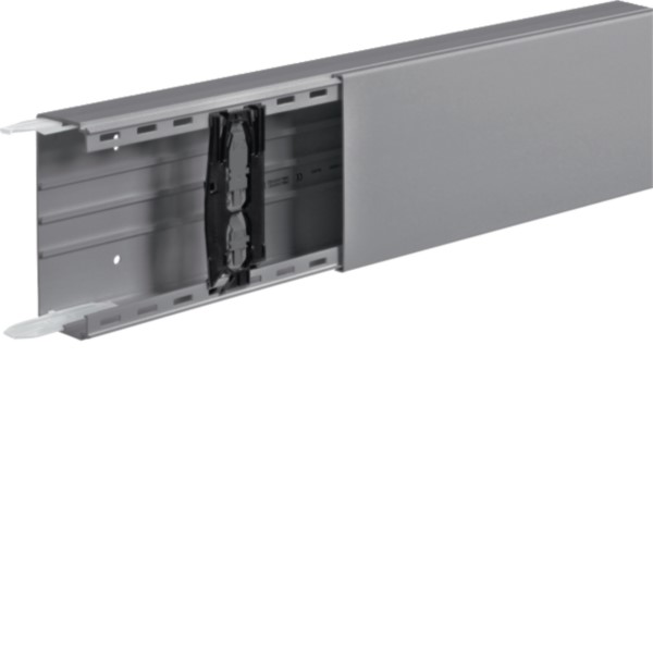 Leitungsführungskanal LF 60x150mm in Steingrau, aus PVC, entspricht DIN EN 50085-1. Ausgestattet mit trennbarem Kanalunter- und -oberteil, einrastbaren Trennwänden und vorgestanzter Bodenlochung (125 mm Abstand). Inklusive vormontierter Kupplungen und Rückhalteklammern für vereinfachte Ein-Mann-Montage.