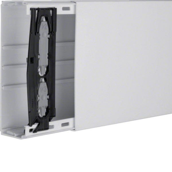 Leitungsführungskanal LF 60x190mm aus PVC in Lichtgrau, entspricht DIN EN 50085-1. Features: Trennwand-Einbaumöglichkeiten, einrastbares Kanalunterteil/-oberteil, vorgestanzte Bodenlochung im 125 mm Abstand, vormontierte Kupplungen und Rückhalteklammern. Geeignet für strukturierte Kabelorganisation in Elektroinstallationen.