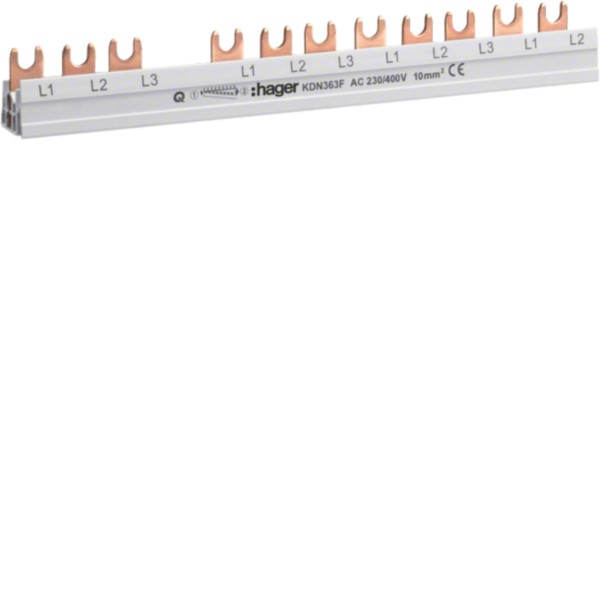 Modulare Phasenschiene, 3-polig mit Gabelanschluss für 12 Module. Geeignet für die Verteilung von bis zu 63A über ein 10mm² Kabelquerschnitt. Die Kammschiene ermöglicht eine effiziente und sichere Verteilung der elektrischen Energie in Installationsverteilern. Ideal für den modularen Aufbau in Schaltschränken.