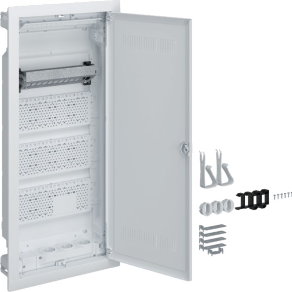 Mit dem VU48WWH präsentiert einen Multimedia-Kleinverteiler für die Unterputzmontage. Mit 4 Reihen und geschlitzter Kunststofftür, Schutzart IP30 und zertifiziert nach DIN VDE 61439-3 eignet er sich perfekt für Elektroinstallationen im Innenraum. Mit Patchpanel und isolierter DIN-Hutschiene zur Integration verschiedener Kommunikationsmodule und 90° schwenkbarer, 3fach-Schutzkontakt-Steckdose bietet der VU48WWH höchste Performance und das in gewohnter Hager-Qualität.