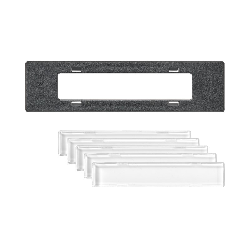 besteht aus 5 Klebeschildern und einem Montageadapter zur Positionierung der Schilder auf den Rahmen ohne Schriftfeld Ersatzteil: Klebeschild Art.-Nr.: AC 80 NA (Beschriftungsfläche 9 x 54 mm) Ersatzteil: Montageadapter Art.-Nr. AC 80 MA zur Positionierung des Klebeschilds Art.-Nr. AC 80 NA