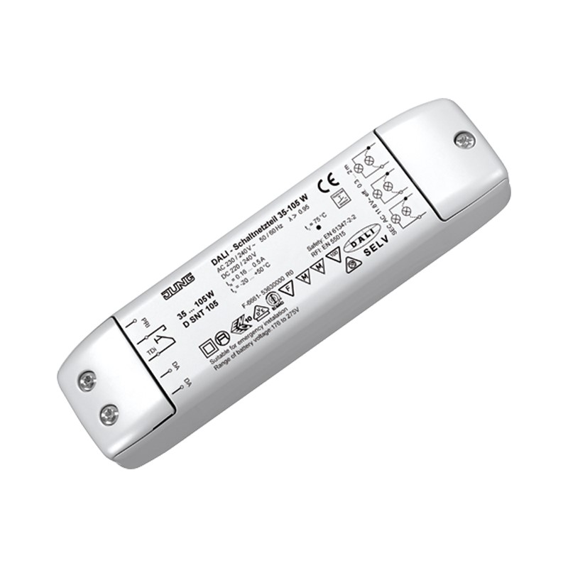 Bestimmungsgemäßer Gebrauch Spannungsversorgung für 12-V-Halogenlampen Schalten und Helligkeitseinstellung erfolgt mit DALI Steuergeräten oder Installationstaster Einbau in Zwischendecken oder Aufputzmontage Produkteigenschaften Leerlaufsicher Elektronischer Kurzschlussschutz Elektronischer Überlastschutz Elektronischer Übertemperaturschutz Geeignet für Betrieb in Anlagen mit Notstromversorgung Nennleistung: 35 ... 105 W Nennspannung: AC 230 ... 240 V ~ Netzfrequenz: 50/60 Hz Ausgangsspannung: 11,5 V eff. ~ 40 kHz Kurzschlussschutz: elektronisch Sekundärleitungslänge: max. 2 m Maße: 170 x 44 x 34 mm Umgebungstemperatur: max. 50 °C Anschlüsse: Schraubklemmen primär 1 x 0,5 ... 1,5 mm2 sekundär 1 x 0,75 ... 2,5 mm2 Prüfzeichen: VDE- Hersteller-Artikelnummer (MPN)