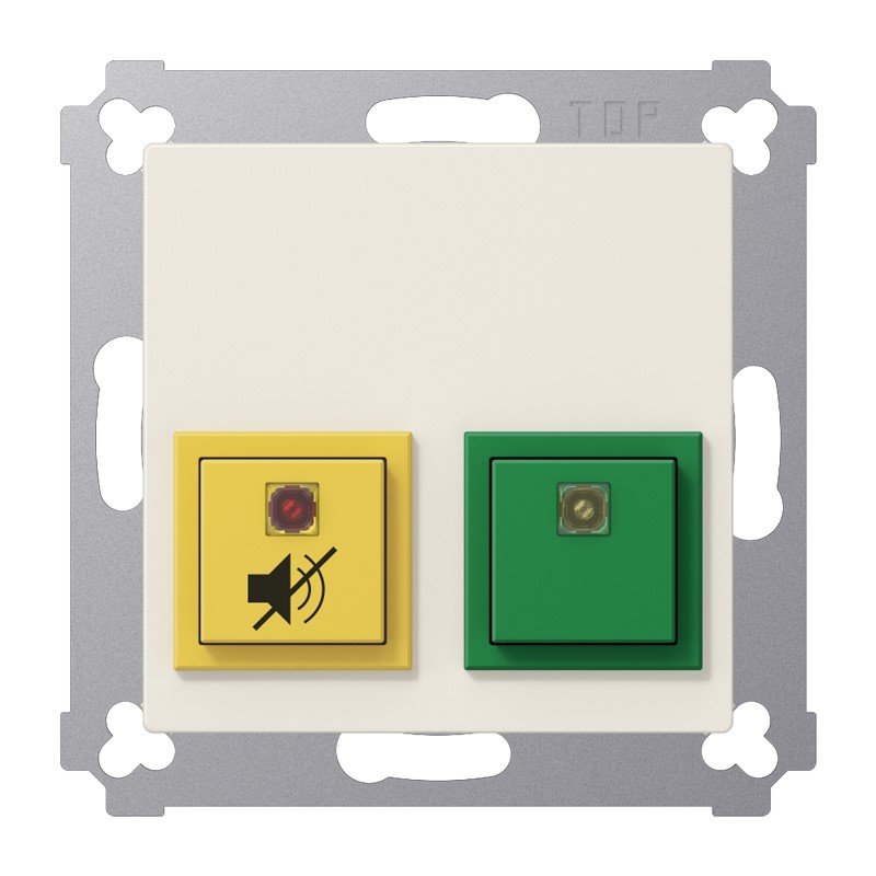 (Schraubbefestigung, ohne Befestigungskrallen) ohne Rahmen Die Dienstzimmereinheit kann zusätzlich zu den Komponenten des Notrufsets installiert werden, z.B. in einem Personal- oder Empfangsraum. Eine grüne Taste markiert die Anwesenheit, eine gelbe Taste unterdrückt das akustische Notrufsignal des Rufmoduls für 20 Sekunden. Material: Thermoplast